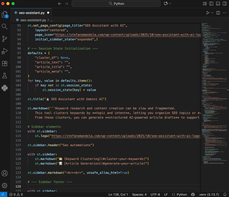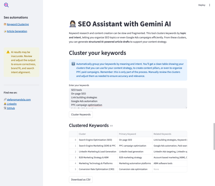 I use Python to optimize workflows and extract meaningful insights from data, improving productivity and outcomes. As a personal challenge to push my Python skills further, I recently built an SEO Assistant connected to Gemini AI that clusters keywords, generates structured articles, and exports results in .csv or .docx. The output provides a solid draft, keeping in mind that obviously human review and the addition of your unique insights and EEAT (Experience, Expertise, Authoritativeness, Trustworthiness) signals are needed to make it fully effective.